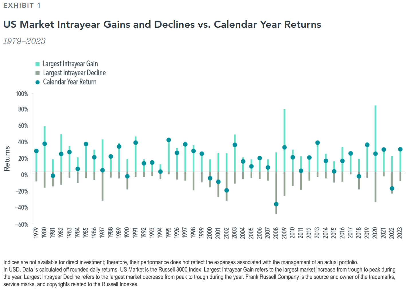 When you invest, you can expect that both ups and downs will be part of the ride. Decades of stock market returns demonstrate how often declines can happen. For evidence, look at the largest intrayear declines for the US stock market in every year from 1979 to 2023. Those declines average to -14%. However, 37 of the past 45 calendar years have ended with positive returns for the US stock market (see Exhibit 1). So instead of getting anxious over a near-term drop, keeping an eye on the horizon can help investors keep the queasiness at bay.