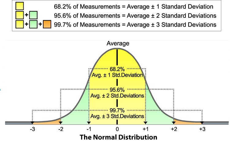 The normal curve shown below is a smooth, bell-shaped curve which represents graphically the normal distribution. The normal distribution is not an actual distribution of coin flips, monthly market returns, test scores or of other measures. Instead, it is a mathematical model—a theoretical distribution—the area of which is taken to be infinitely large. For Index Portfolio 100 and the MarketCoin, the center line would be 1.4%, with the returns to the left being Down and the returns to the right being Up.