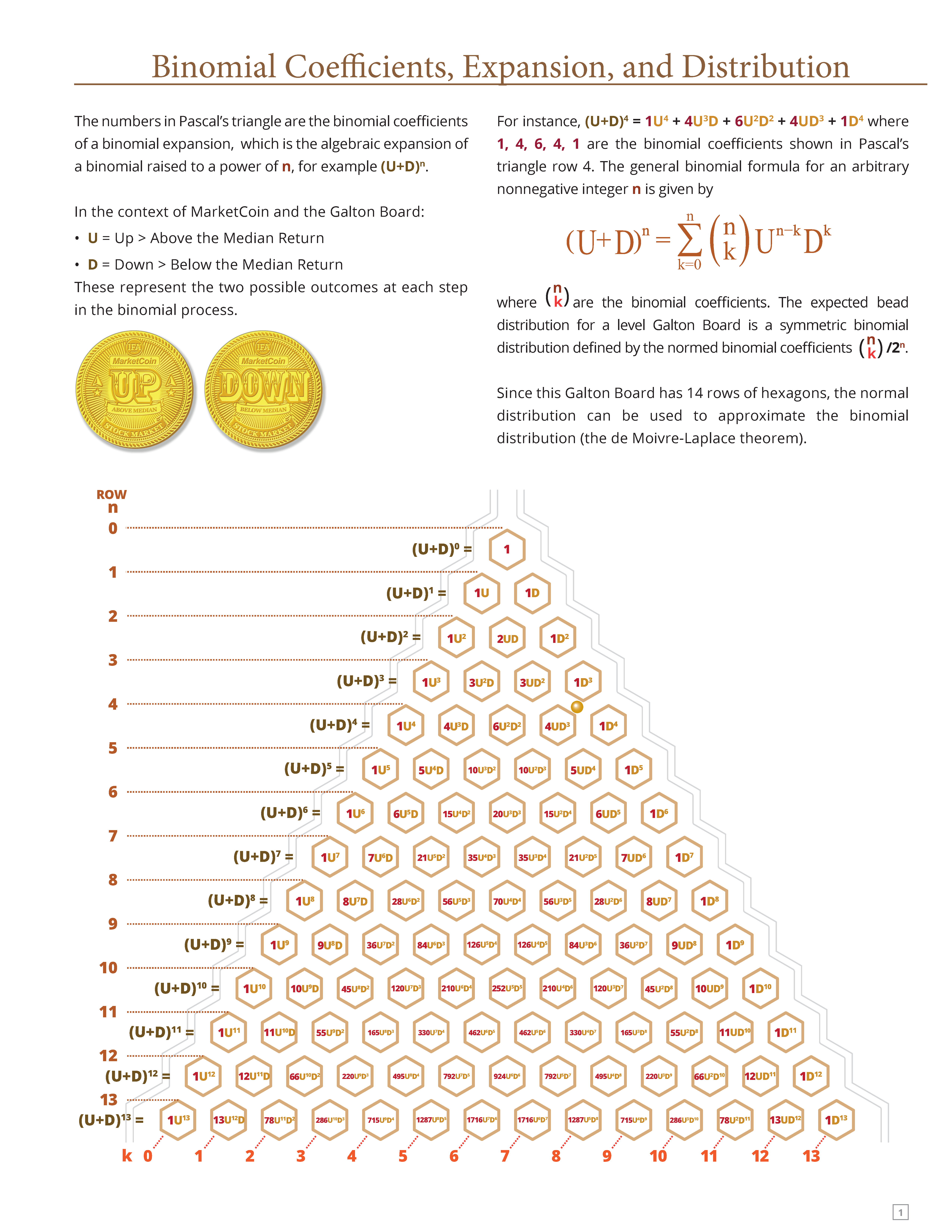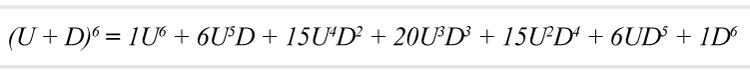 The number of possible outcomes from 6 flips can be calculated as 2 to the power of 6. In algebra, the two possible outcomes tested over multiple times is known as the binomial expansion where (U D)⁶ will give the expected outcomes of the 64 combinations (2 to the 6th power) of Ups and Downs when the MarketCoin is tossed 6 times in a row. So, in 6 months there are 64 combinations of the sequences of Ups and Downs.