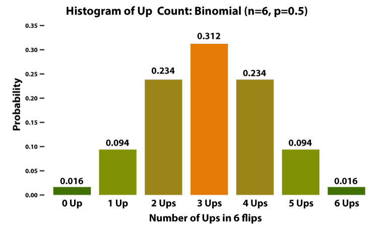 The probability or expectation of any number of Ups from 6 to 0 may be found by dividing the appropriate frequency by possible number of outcomes (N). Thus, the probability of all six months of MarketCoins flips falling Up is 1 in 64 since there are 64 possible combinations of Ups and Downs but only one in which all coins are Up. The highest probability, namely, 20/64 (31.2%) is for three Ups and three Downs. There are 6 chances in 64 that the coins will fall one Up and five Downs, and only 1 chance in 64 that no Ups will appear—that all coins will show Downs. A histogram describing the frequency distribution in the table is shown below.