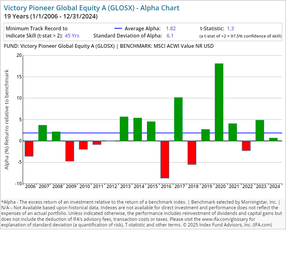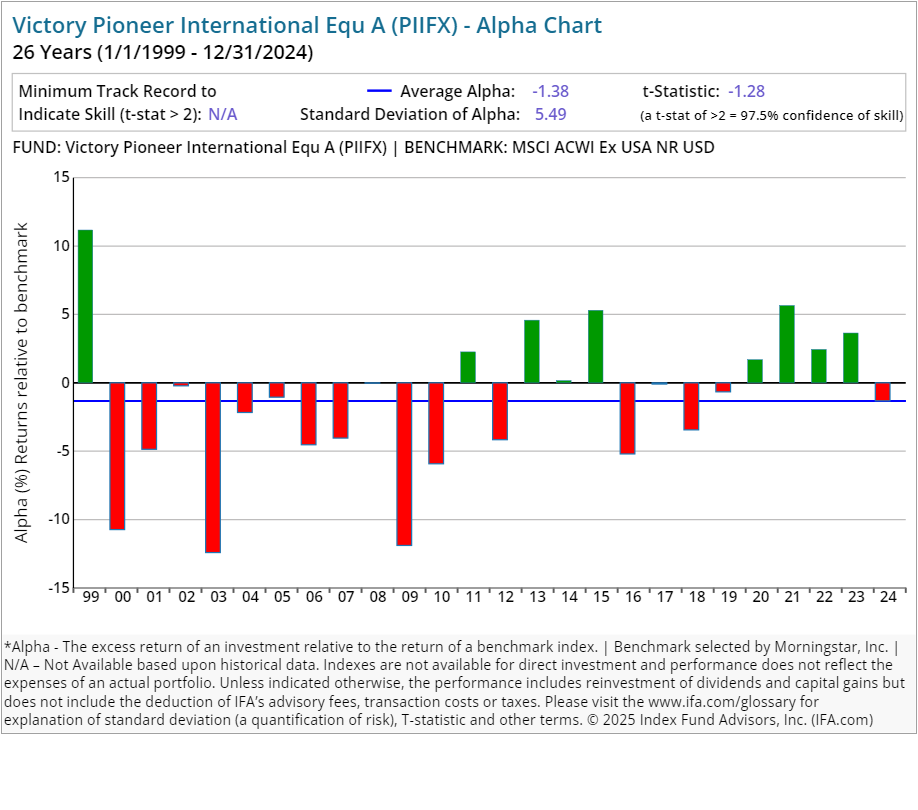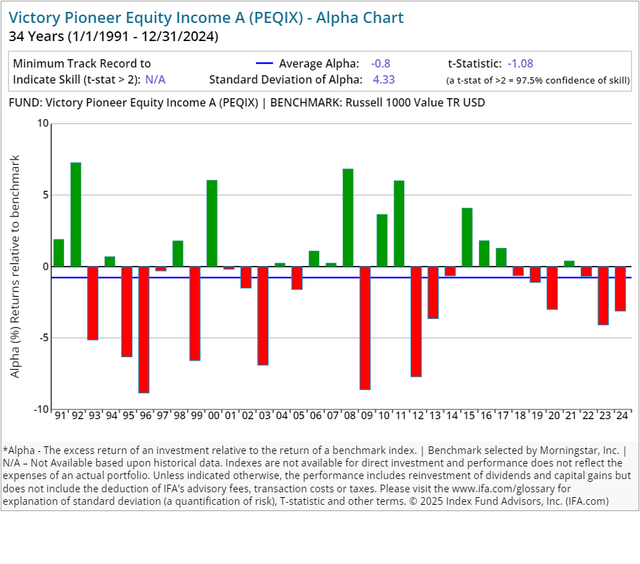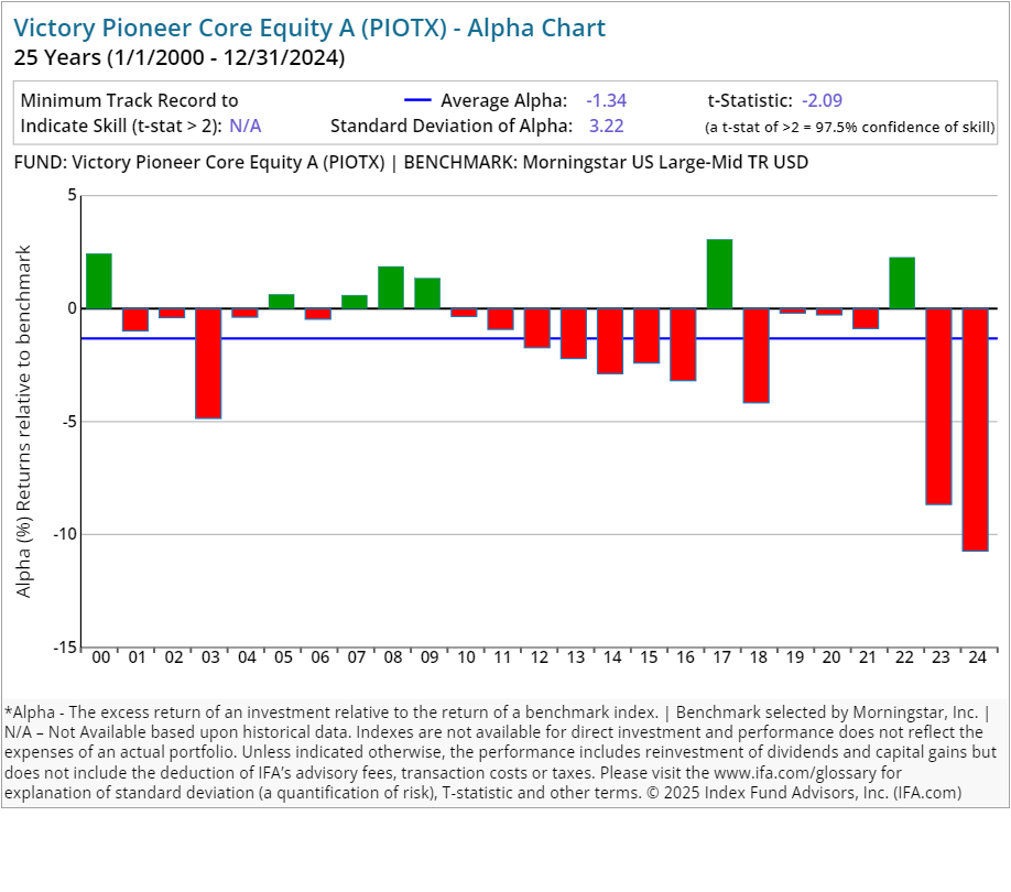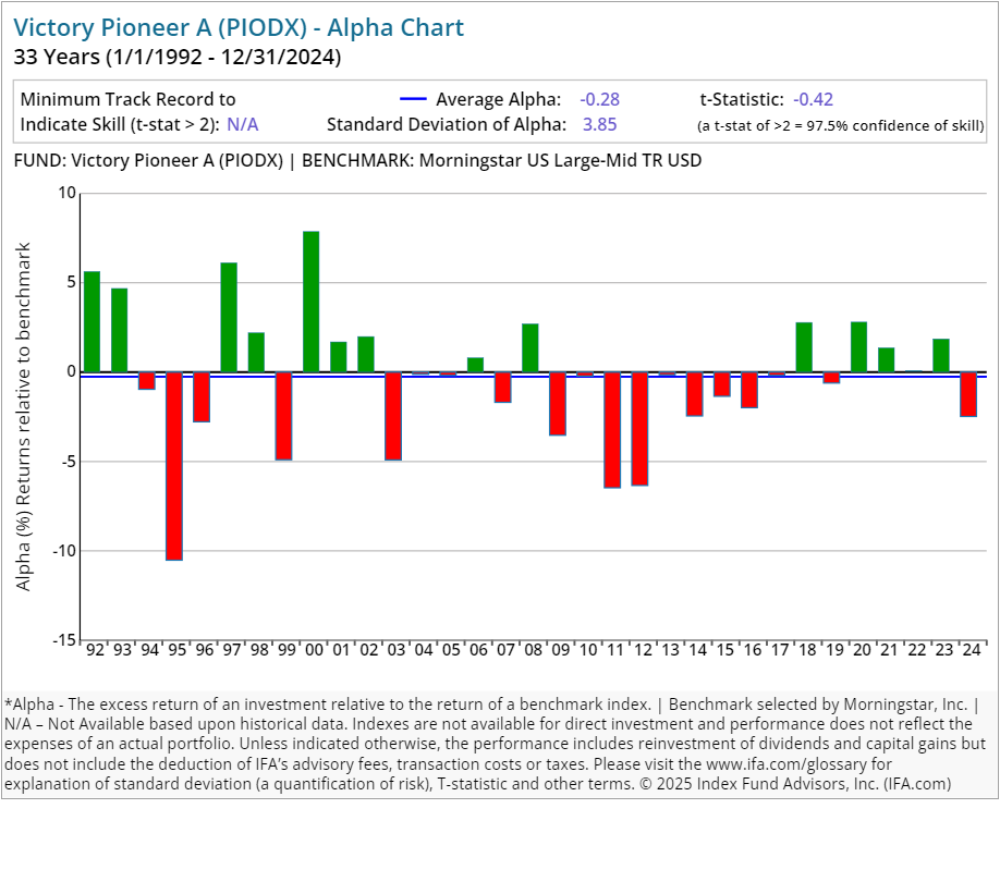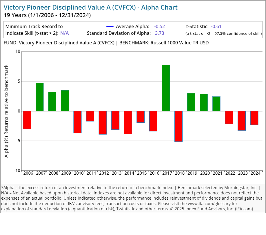 It's safe to say that the majority of funds offered by Victory Capital have not outperformed their Morningstar assigned benchmark. The inclusion of the statistical significance of alpha is key to this exercise, as it indicates which outcomes are due to a skill that is likely to repeat and those that are more likely due to a random-chance outcome.