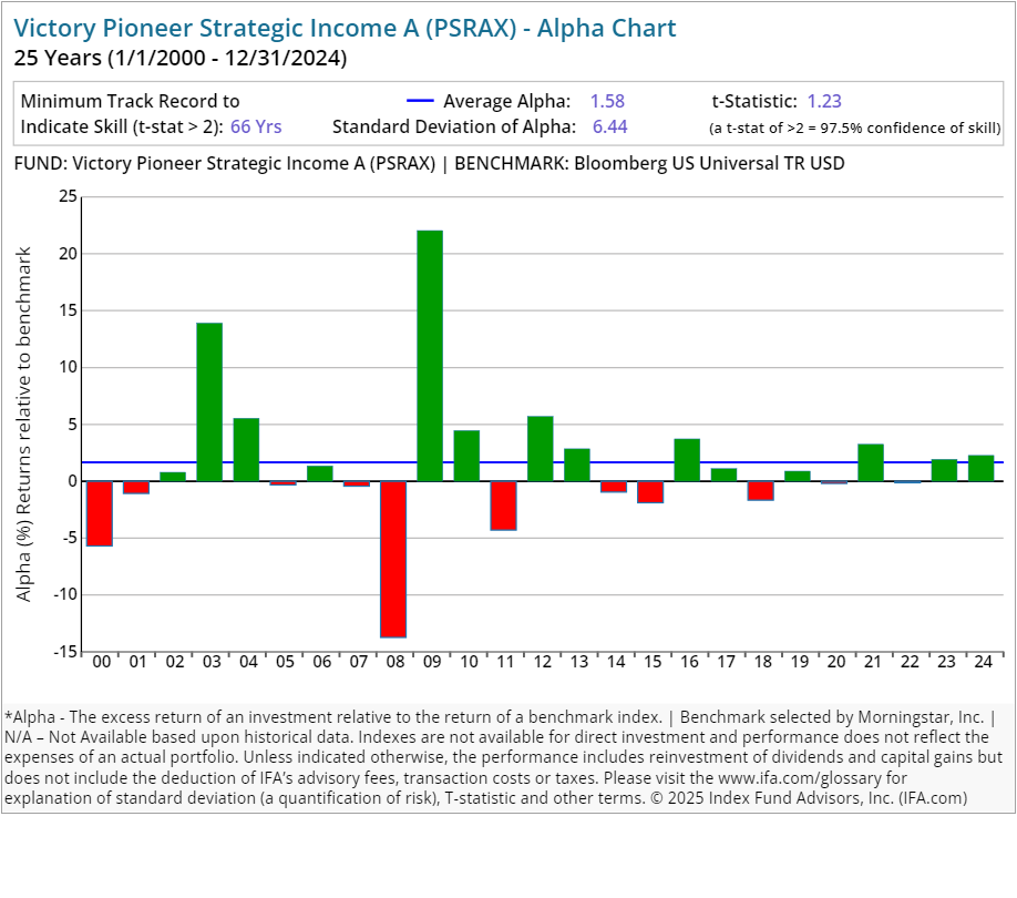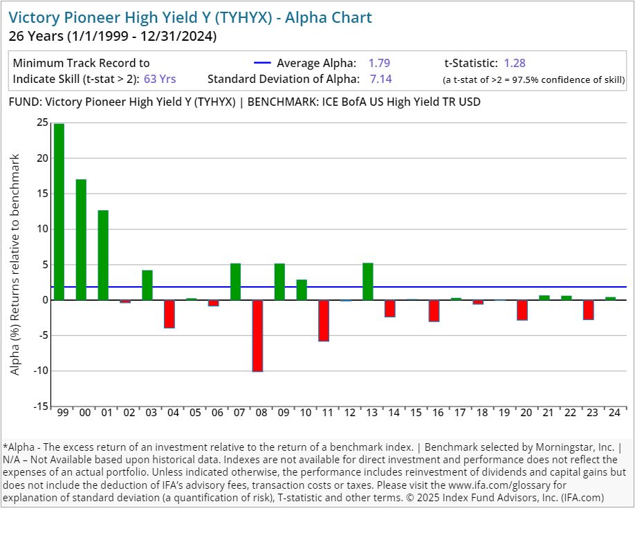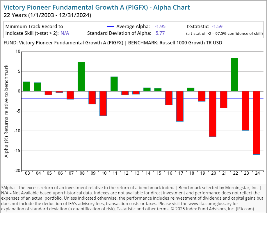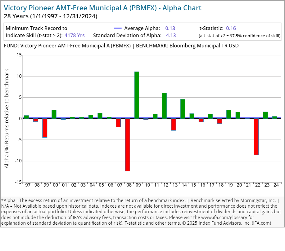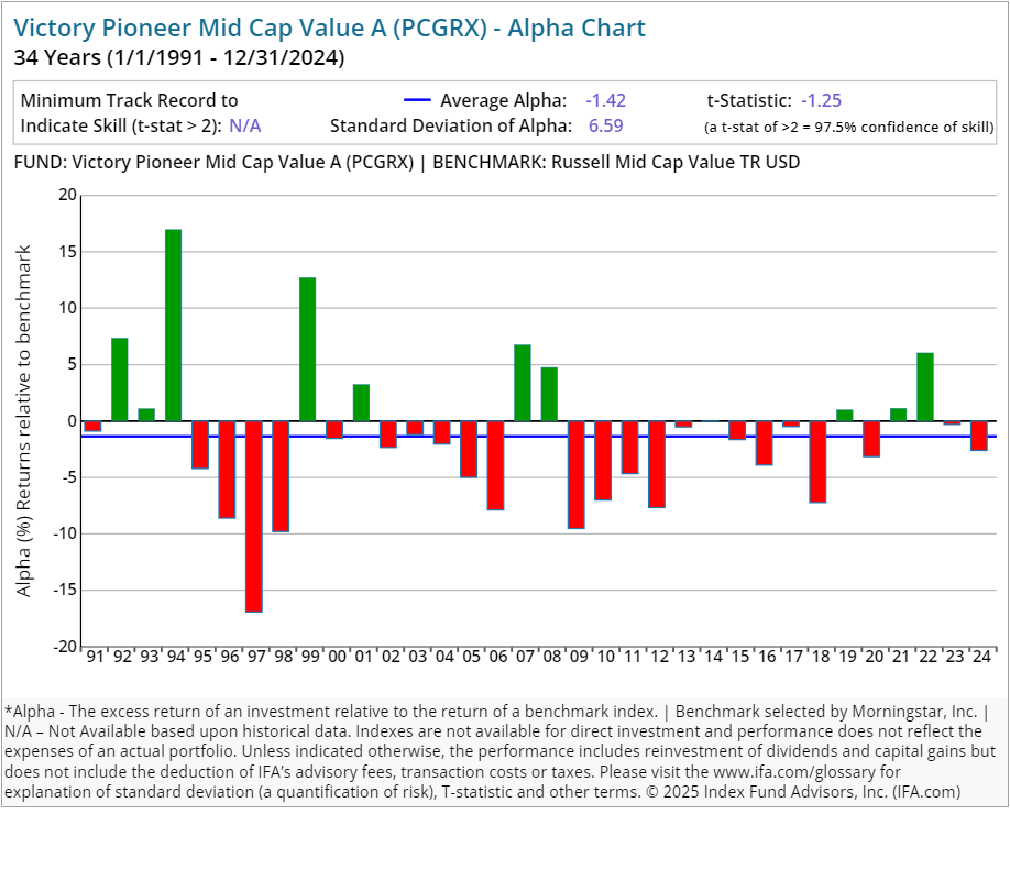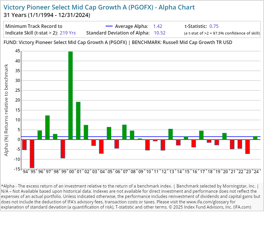 It's safe to say that the majority of funds offered by Victory Capital have not outperformed their Morningstar assigned benchmark. The inclusion of the statistical significance of alpha is key to this exercise, as it indicates which outcomes are due to a skill that is likely to repeat and those that are more likely due to a random-chance outcome.