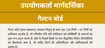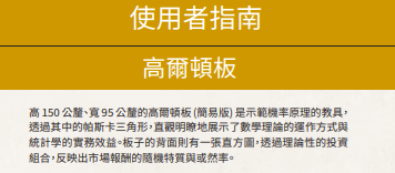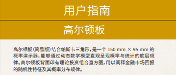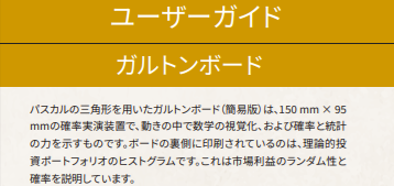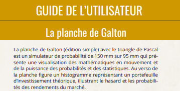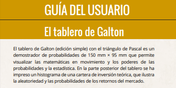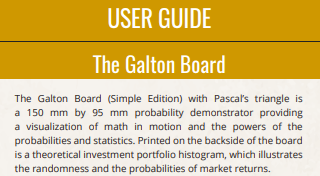The Galton Board (Simple Edition) with Pascal's triangle is a 6.5 inch by 4.5 inch probability demonstrator providing a visualization of math in motion and the powers of the probabilities and statistics. Printed on the backside of the board is a theoretical investment portfolio histogram, which illustrates the randomness and the probabilities of market returns.