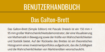 IFA Galton Boards come with a detailed, full color 32 page User Guide. The user guide covers over 15 mathematical items of interest such as Pascals Triangle, Binomial Theorem, Fibonacci Numbers and many more that are built into the galton board.